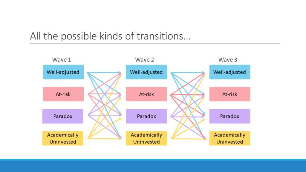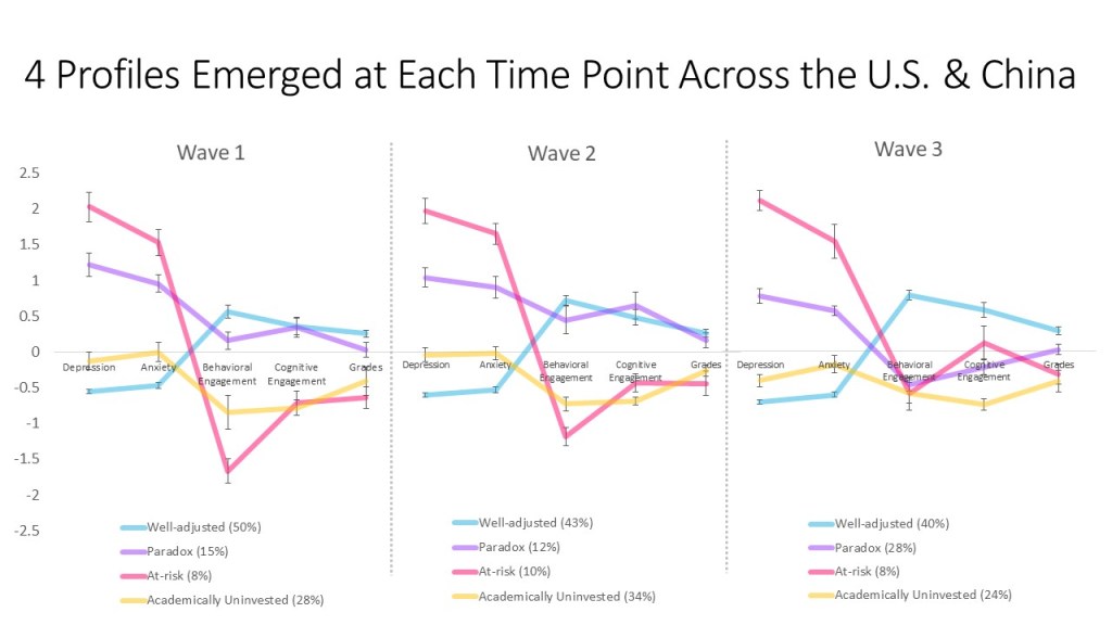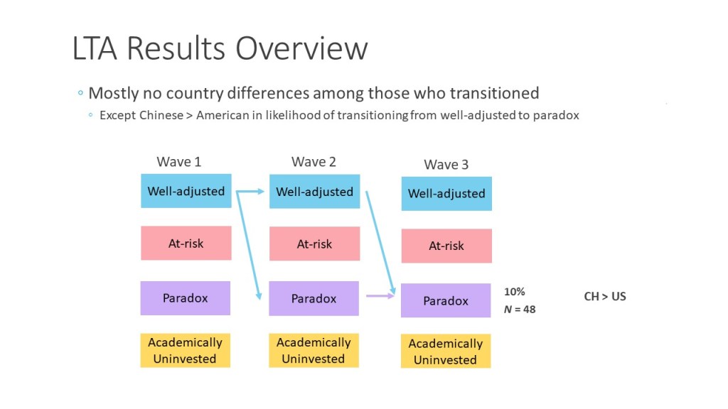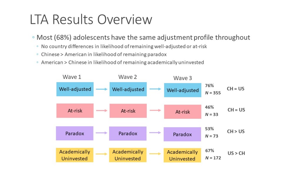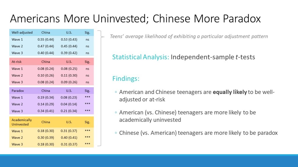 Implications: The implications are twofold. Understanding the different types of adjustment patterns and their prevalence in not only the West but also the East is a key step to investigating what leads teenagers to exhibit one pattern over another. For example, if indeed Chinese (vs. American) teenagers were more paradox while American teenagers were more academically uninvested, what might Chinese and American parents and teachers be doing differently that contribute to this difference? What might be making some kids academically uninvested rather than well-adjusted? Importantly, knowing the types and prevalence of different adjustment patterns will also inform intervention efforts that aim to optimize teenagers’ well-being by effectively targeting specific areas in which they need help (e.g., what paradox kids need may not be what academically uninvested kids need).
